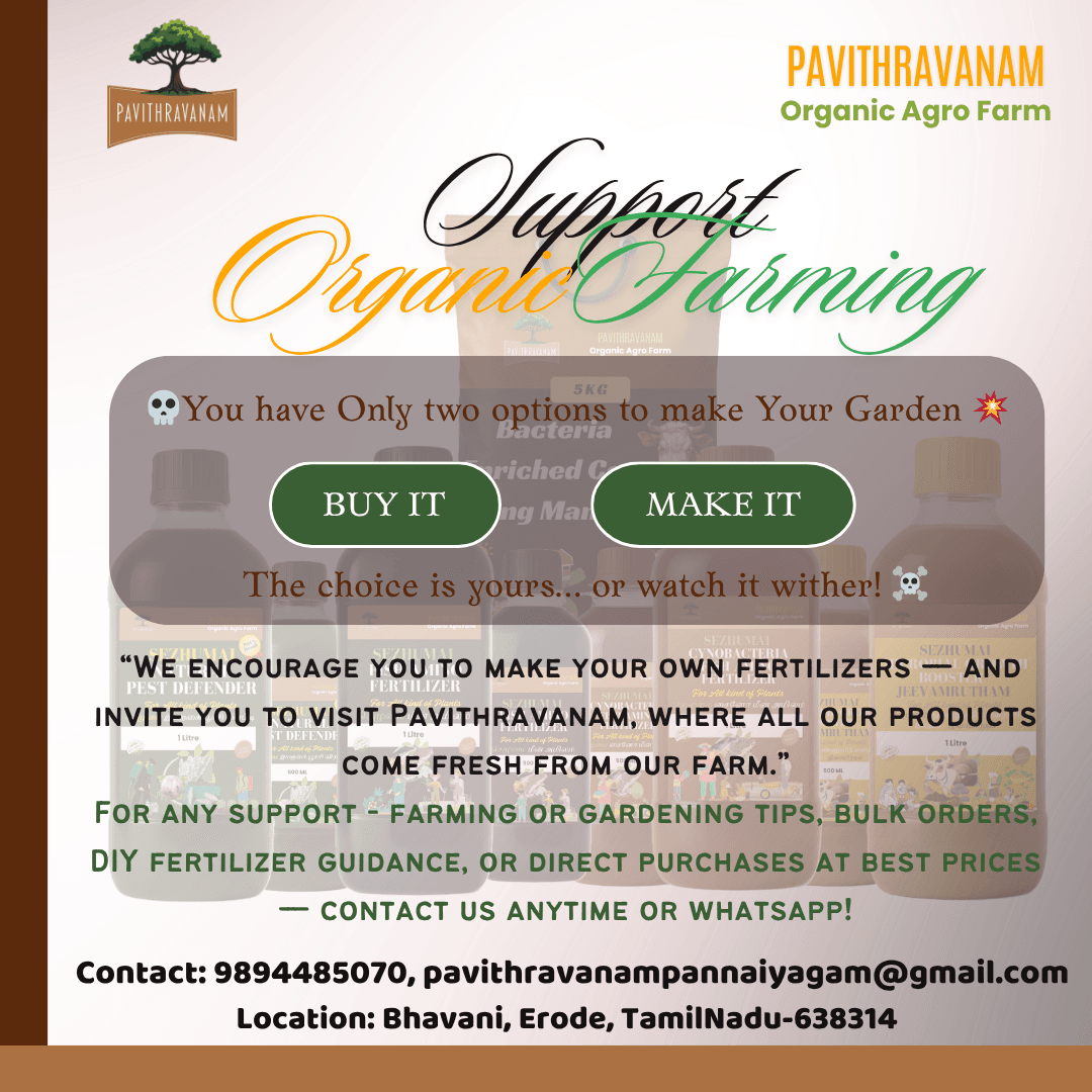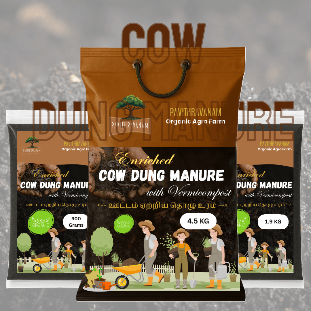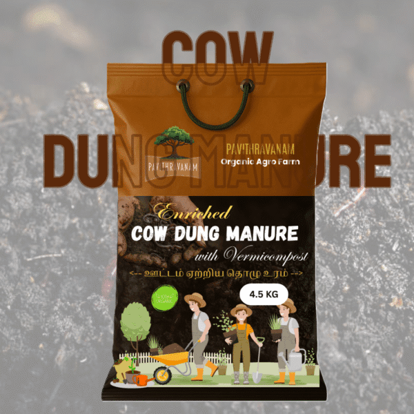 Pavithravanam’s Enriched Cow Dung Manure with Vermicompost is a powerful combination of desi cow dung compost and high-quality vermicompost made using earthworms. This dual-action organic fertilizer enhances microbial activity, improves soil texture, and supports robust plant growth – naturally.