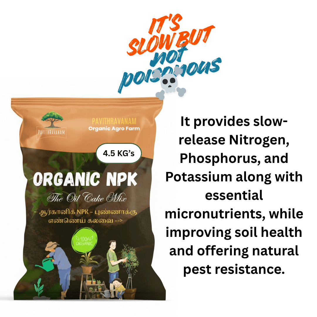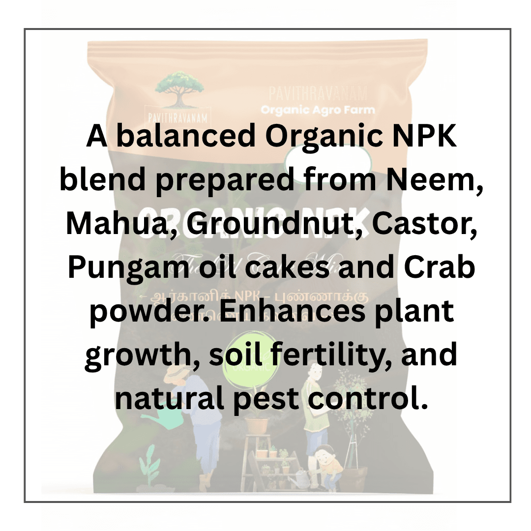 Organic NPK – Oil Cake Mix is a premium natural fertilizer made from a balanced blend of Neem, Mahua, Groundnut, Castor, and Pungam oil cakes, enriched with natural crab powder (bio mineral). This unique formulation provides slow-release Nitrogen, Phosphorus, Potassium, and essential micronutrients to support healthy and sustainable plant growth.