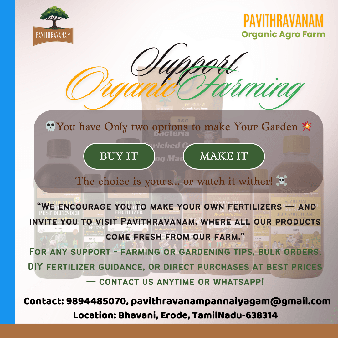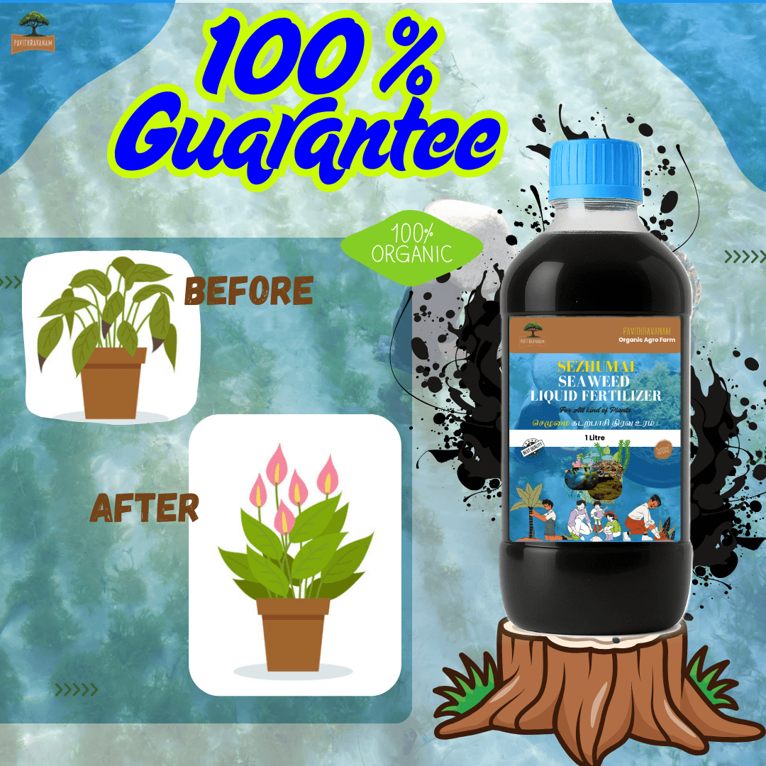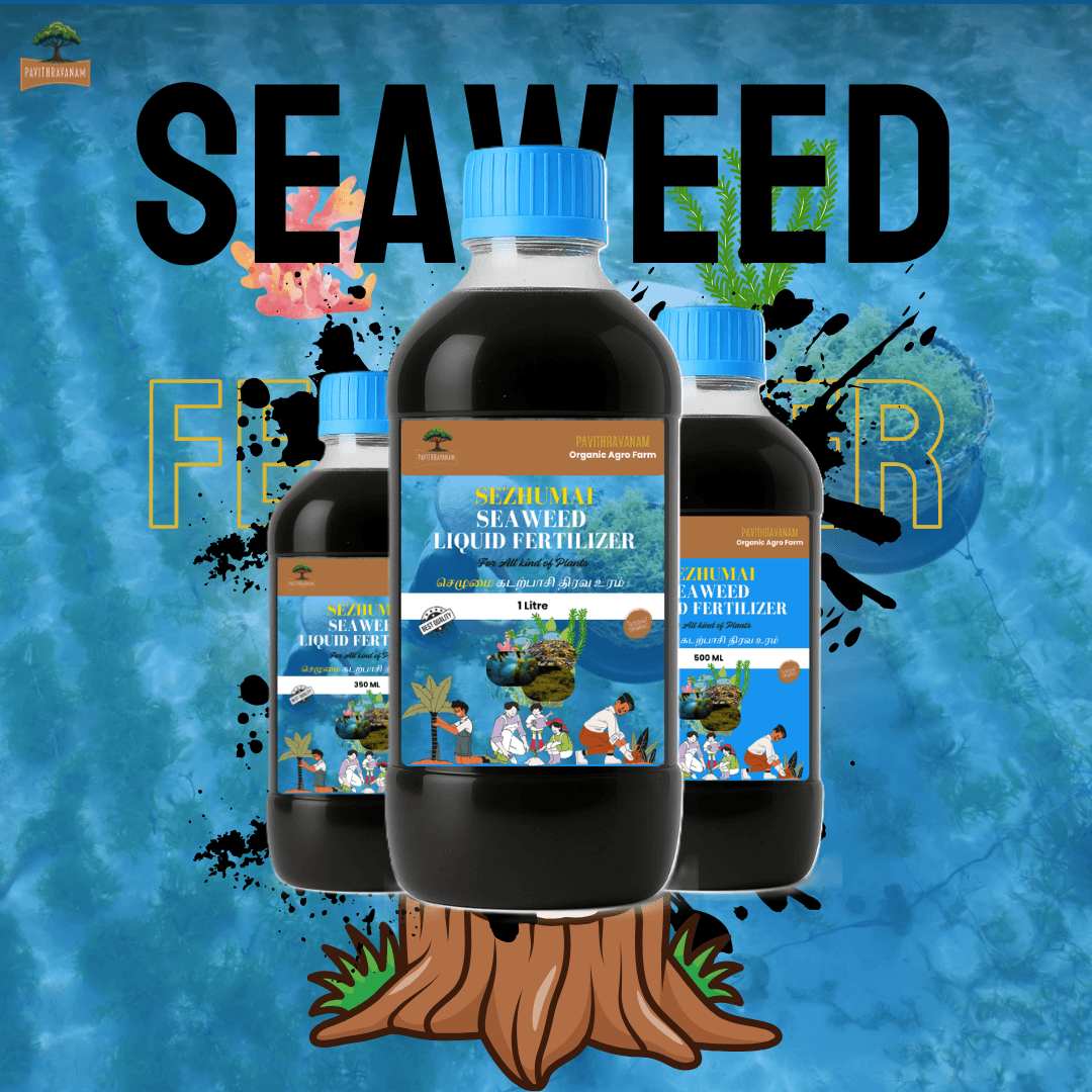 Pavithravanam’s Seaweed Liquid Fertilizer is a nutrient-rich tonic extracted from marine plants, specially formulated to enhance root development, flowering, and resistance to diseases. It is suitable for terrace gardens, home farming, and organic agriculture.